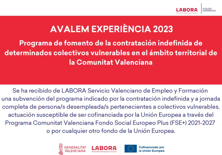 La empresa JFG Euroservice SL promueve la contratación indefinida y la ha obtenido dos subvenciones de LABORA Servicio Valenciano de Empleo y Formación gracias al Programa